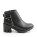 Botín negro de estilo moderno con acabado tipo piel, ideal para looks casuales y semi-formales. Su tacón bloque alto y suela dentada ofrecen estabilidad y buen agarre, mientras que los detalles metálicos dorados como la cremallera decorativa lateral y la hebilla en el tobillos añaden un toque sofisticado. El tirador trasero facilita el calce, convirtiéndolo en una opción práctica y elegante para el día a día.