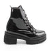 Bota negra con acabado charol que aporta un look audaz y moderno. Su diseño incluye agujetas con herrajes metálicos, suela gruesa dentada para excelente tracción y tirador trasero para facilitar el calce. Ideal para outfits urbanos, casuales o semi-formales que buscan personalidad y resistencia sin perder estilo. Una opción versátil que combina moda y funcionalidad en cada paso.