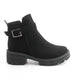 Botín negro con diseño moderno y funcional, elaborado en material tipo gamuza para un acabado elegante y suave al tacto. Su suela gruesa con dibujo texturizado ofrece excelente tracción, mientras que el tacón moderado aporta estilo sin sacrificar comodidad. Incluye cierre lateral para un calce rápido y seguro, además de una correa decorativa con hebilla metálica que añade un toque distintivo. Ideal para combinar con atuendos casuales o semiformales.